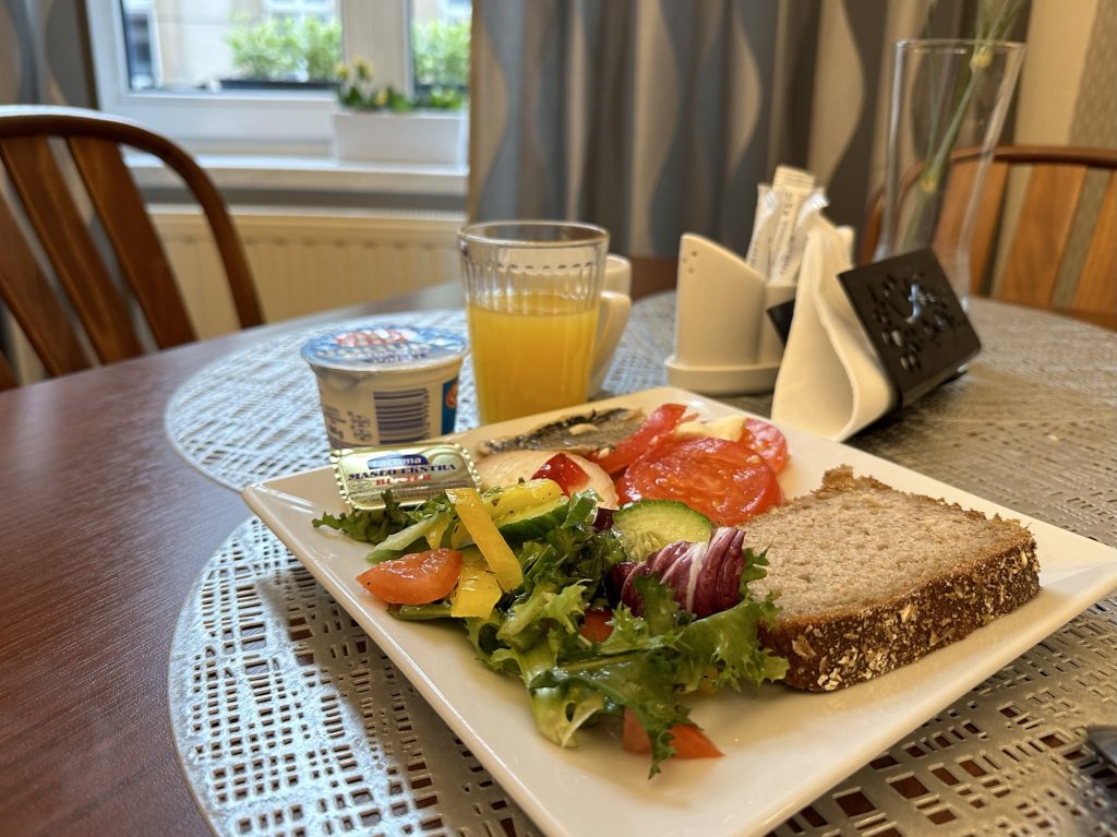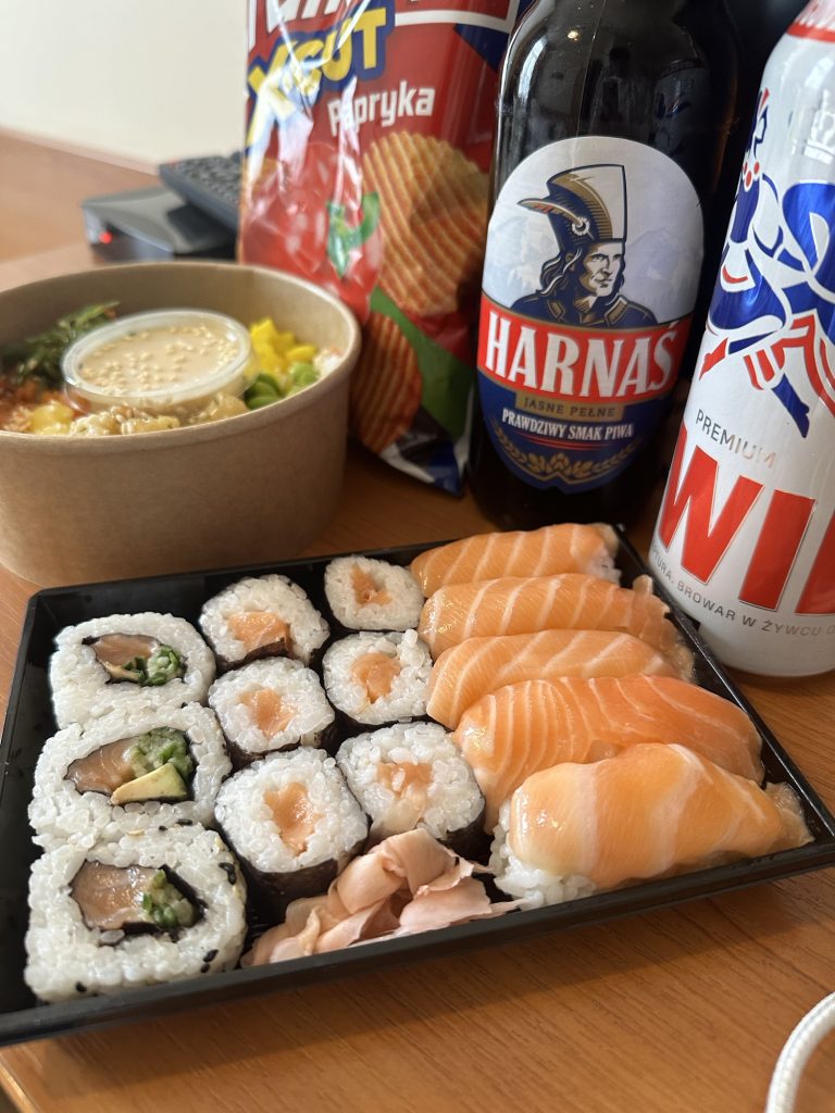電車だとクラクフまであっという間に感じました。お昼を食べていなかったので、スーパーでお寿司を買ってホテルで食べました。海外で普通に売られているお寿司を一度食べてみたいという夫の希望です。ご飯がやや硬かったですが、サーモンは日本で食べるのと同じ味がしました。